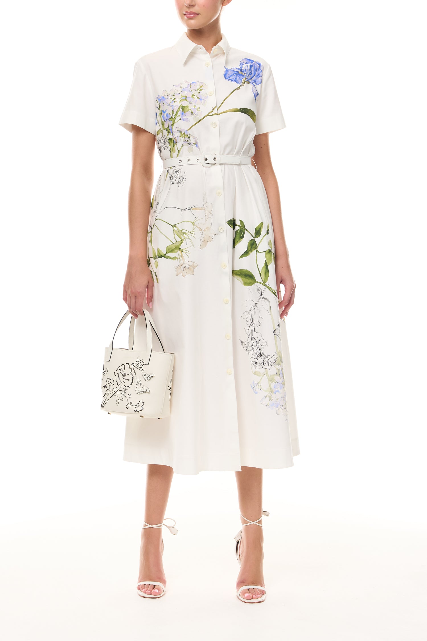 Monique Lhuillier Spring 2026 Ivory/Multi Iris Bouquet Printed CrepeShort sleeve bias gown -  front. Monique Lhuillier Spring 2026 Ivory/Multi Iris Bouquet Printed CrepeShort sleeve bias gown - fabric.