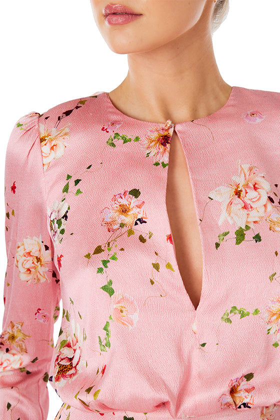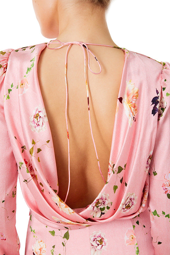 Our Floral Long Sleeve Gown in Peony/Multi is a vision of effortless elegance. Crafted from floral crepe-back satin, this floor-length design features a front keyhole bodice and a low open back, creating a striking and refined silhouette. A blouson waistline enhances the gown’s fluidity, while billowed sleeves taper into gently gathered cuffs. A delicate string ties at the back neckline, where fabric expertly drapes into the waist seam before flowing into a floor-length skirt. Finished with a sweeping train, this gown exudes romance with every step.